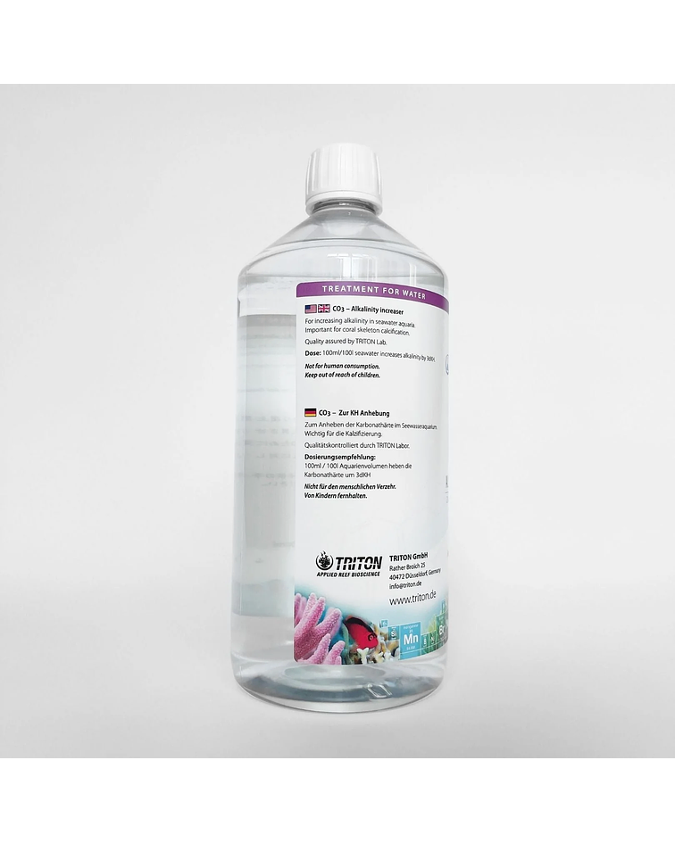 Si se requiere aumentar la Alcalinidad del agua de su acuario, al aditar 100ml por cada 100 litros de agua de su acuario, esto aumentará la alcalinidad en 3dkH.